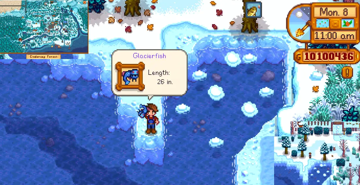 Glacierfish are a type of fish that can be found in Stardew Valley. They require a fishing level of 6 to catch and can be found in the middle of the river. The best time of day to fish for them is during the daytime, and the only time of year to fish for them is during the winter. They are more active during the cold months and are more likely to spawn then. The best place to catch Glacierfish is under Andy’s farm, but they can also be found in other locations.